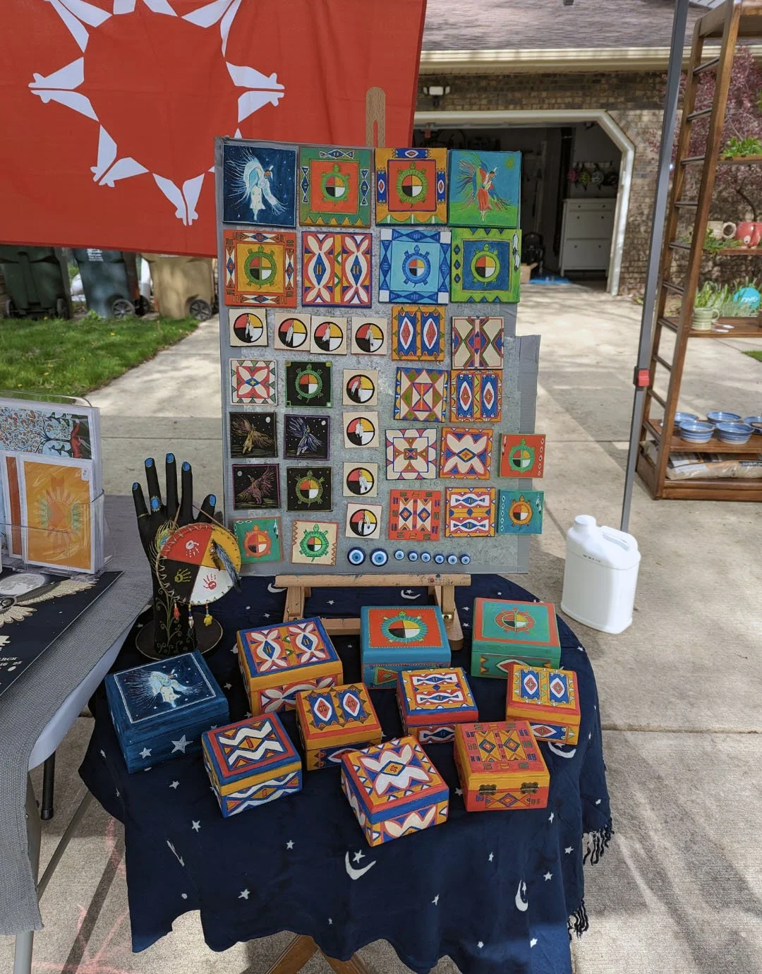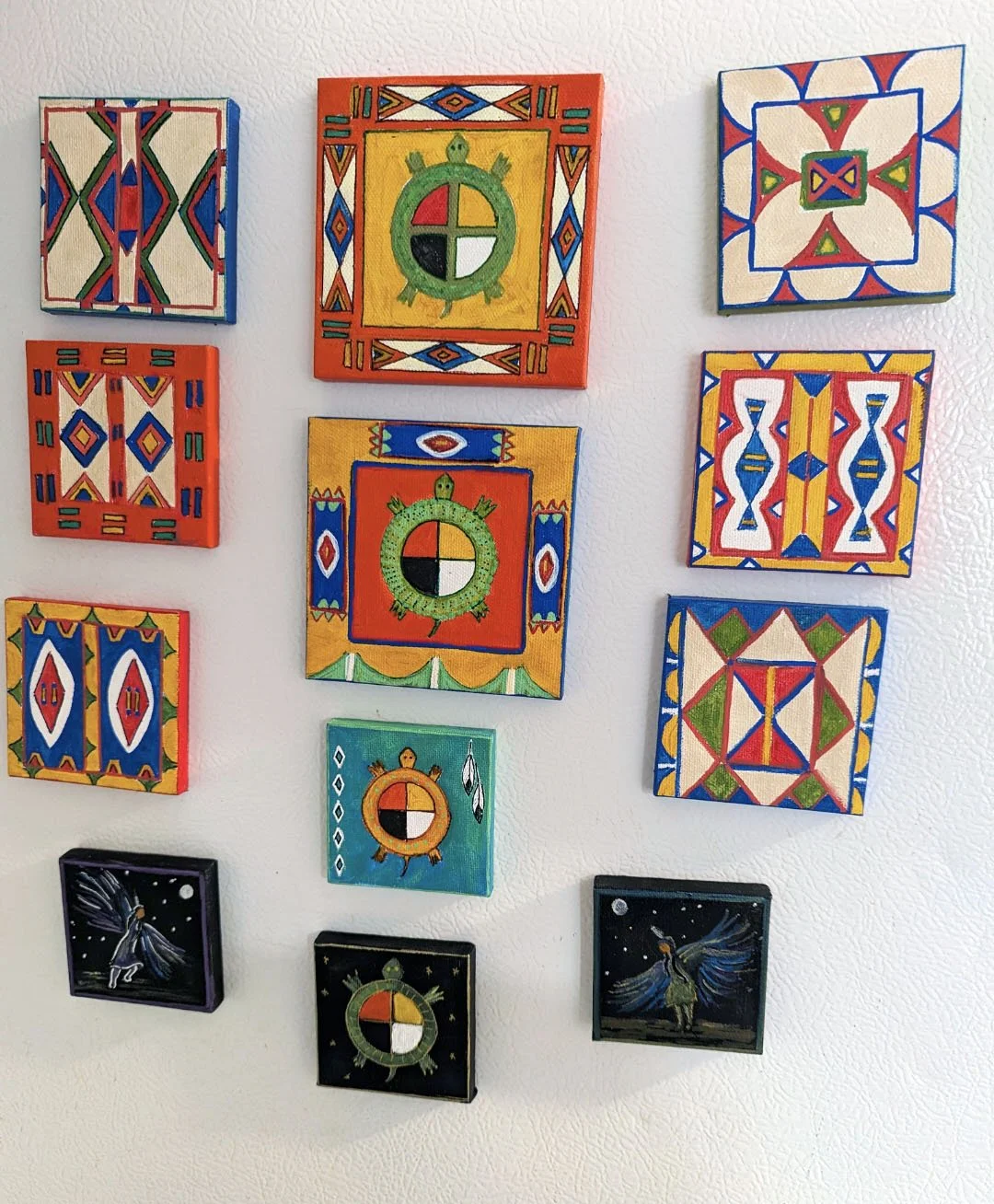 Liz is an enrolled member of the Oglala Sioux Tribe and is self taught in acrylic painting, beadwork, and fiber arts. Most of her work reflects her Native heritage in a combination of traditional and contemporary design painted on small wooden boxes and magnetic mini canvases. She also creates pieces that are not Native designs.